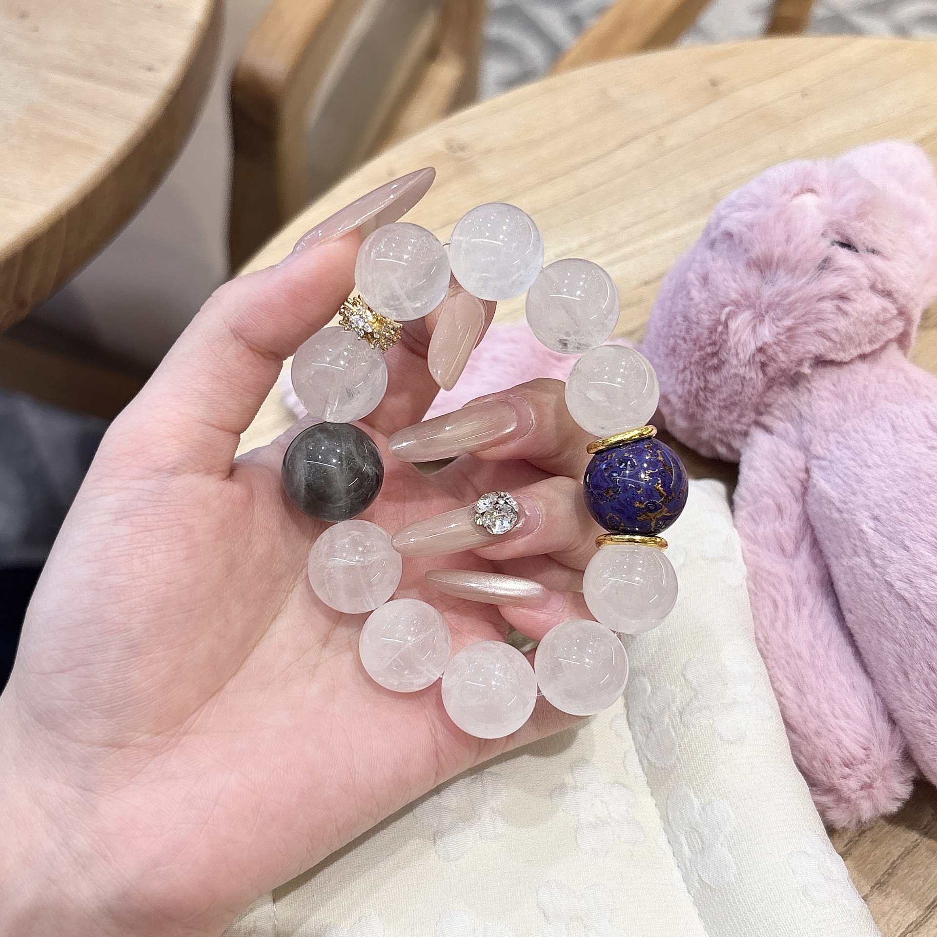 - Design: Handcrafted with translucent white quartz beads, each featuring unique phantom inclusions.